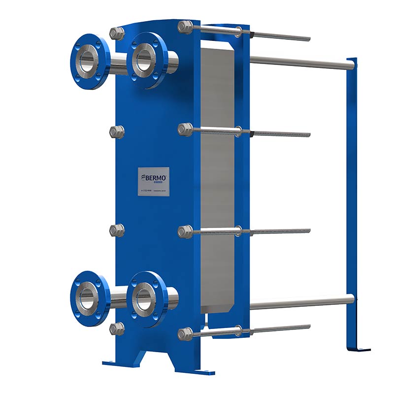é montado entre a placa de estrutura fixa e a placa de pressão móvel, sendo comprimido por parafusos de aperto. As placas são equipadas com uma gaxeta, que veda o canal e direciona os fluidos em canais alternados. O número de placas é determinado pela taxa de fluxo, propriedades físicas dos fluidos, queda de pressão e pelo gradiente de temperatura. As ondulações da placa promovem a turbulência do fluido.