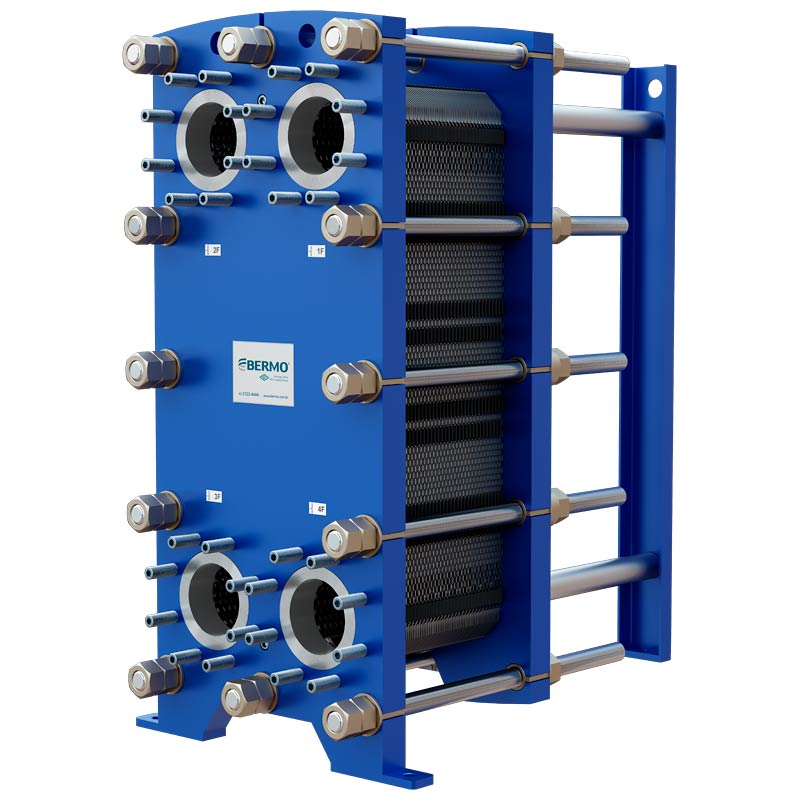 é montado entre a placa de estrutura fixa e a placa de pressão móvel, sendo comprimido por parafusos de aperto. As placas são equipadas com uma gaxeta, que veda o canal e direciona os fluidos em canais alternados. O número de placas é determinado pela taxa de fluxo, propriedades físicas dos fluidos, queda de pressão e pelo gradiente de temperatura. As ondulações da placa promovem a turbulência do fluido.