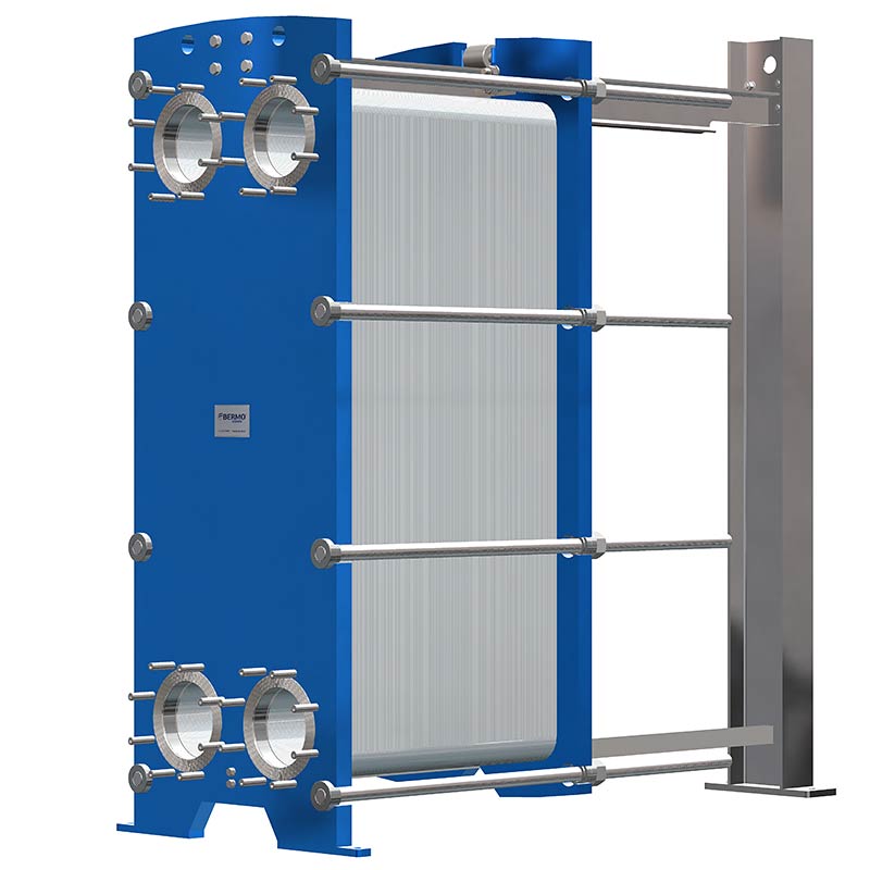 é montado entre a placa de estrutura fixa e a placa de pressão móvel, sendo comprimido por parafusos de aperto. As placas são equipadas com uma gaxeta, que veda o canal e direciona os fluidos em canais alternados. O número de placas é determinado pela taxa de fluxo, propriedades físicas dos fluidos, queda de pressão e pelo gradiente de temperatura. As ondulações da placa promovem a turbulência do fluido.
