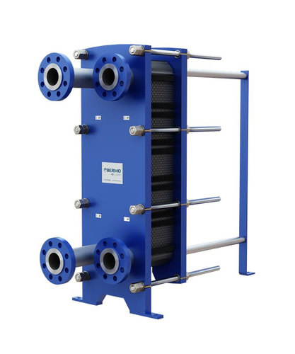 é montado entre a placa de estrutura fixa e a placa de pressão móvel, sendo comprimido por parafusos de aperto. As placas são equipadas com uma gaxeta, que veda o canal e direciona os fluidos em canais alternados. O número de placas é determinado pela taxa de fluxo, propriedades físicas dos fluidos, queda de pressão e pelo gradiente de temperatura. As ondulações da placa promovem a turbulência do fluido.