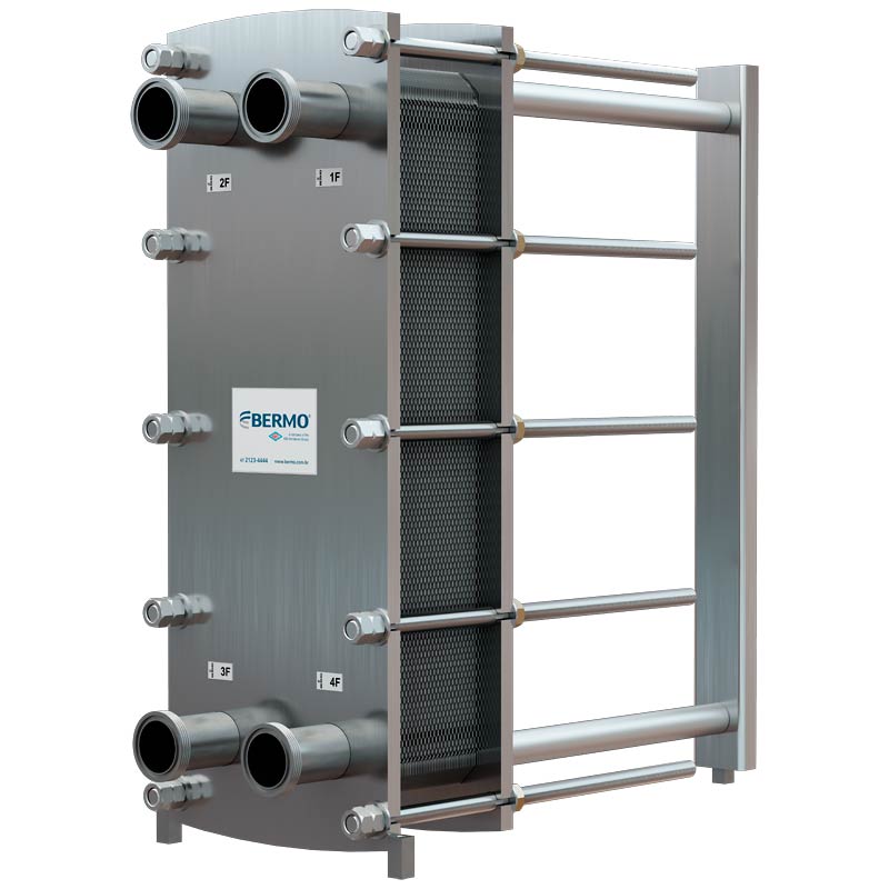 O trocador de calor consiste em um conjunto de placas de metal corrugado, com orifícios para a passagem dos dois fluidos de transferência de calor.